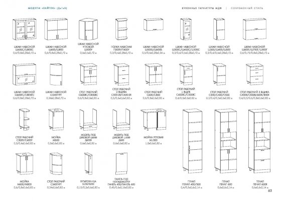 Глубина верхних шкафов указана без учета фасада, высота столов указана без учета столешницы