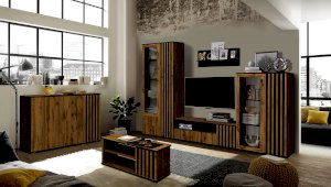 Даже если у вас нет ТВ, то тумба под ТВ должна быть обязательно! Ведь на нее можно поставить все, что захотите - большую плазменную панель, стереосистему или и то, и другое – габариты тумбы это позволяют! В дизайне поддерживается концепция асимметричности. Два отсека-близнеца: открытая полка и под ней выдвижной ящик плюс просторный ящик за распашной дверцей.