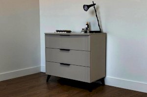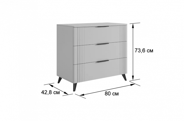 Комод изготовлен из качественных материалов: корпус выполнен из ЛДСП, что гарантирует прочность и долговечность, а фасад, выполненный из МДФ в плёнке ПВХ, не только выглядит эстетично, но и защищает комод от повреждений. Особое внимание заслуживает фрезеровка фасадов, которая придаёт изделию изысканный вид.