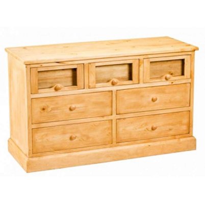 Широкий комод-тумба с основательным цоколем выполнен в стиле Прованс. Между фасадом ящика и стеклом можно вставить фотографии, насыпать крупу или сухоцветы. Этот комод будет удобен и для белья, и для кухонных принадлежностей.