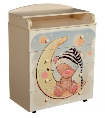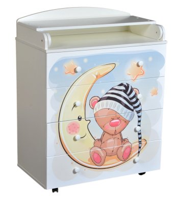 Пеленальный комод 800/4 Lilu 7 отличается привлекательным дизайном с использованием тематических детских принтов. В конструкции изделия предусмотрены 4 маленьких передвижных колеса, несколько вместительных ящичков на шариковых направляющих и откидывающаяся пеленальная столешница. Детский пеленальный комод, декорированный красочным рисунком, вмещает в себя постельные принадлежности, средства гигиены, распашонки, подгузники, игрушки, ползунки и другие личные вещи ребенка. Гладкая столешница идеально подходит для пеленания ребенка, а колесики позволяют быстро перемещать комод.