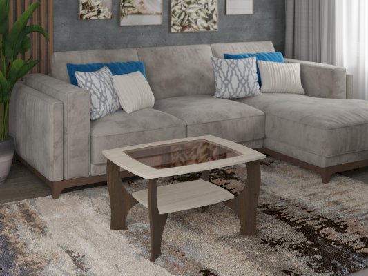 Стол журнальный станет прекрасным украшением интерьера. Столешница оснащается вставкой из тонированного стекла. Фигурные ножки прикрепляются к столешнице и небольшой круглой полочке.